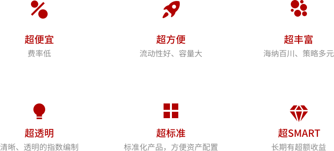 Super ETF是嘉實旗下Smart Beta思想為核心驅動的ETF品牌。具有六大核心優(yōu)勢:超便宜、超方便、超豐富、超透明、超標準、超Smart。