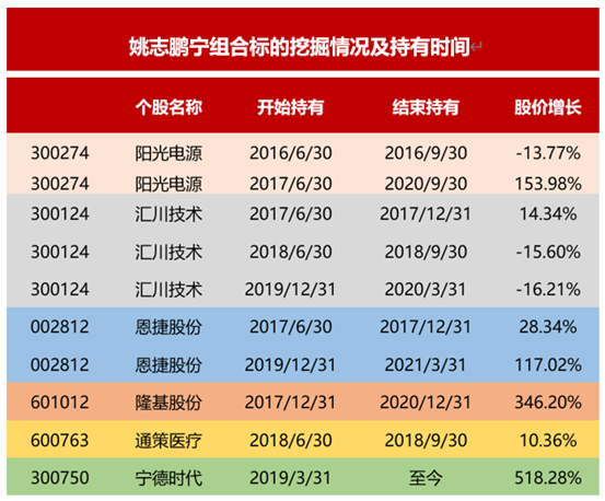究其原因,與率先布局“寧組合”密不可分。分析姚志鵬管理產(chǎn)品持倉(cāng)可以發(fā)現(xiàn),“寧組合”中大部分標(biāo)的在較早時(shí)期便被挖掘,例如陽(yáng)光電源初次出現(xiàn)在前十大重倉(cāng)時(shí)間為2016年二季報(bào)、恩捷股份、匯川技術(shù)為2017年二季度,顯著領(lǐng)先于市場(chǎng)。