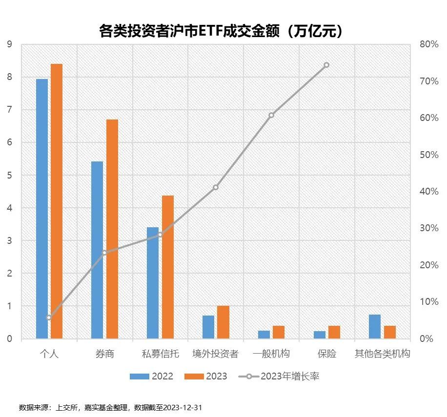 根據(jù)劉斌的介紹,近年來除了ETF客戶總量和機(jī)構(gòu)持有規(guī)模總量快速提升,細(xì)分投資者也日益多元和交易活躍。根據(jù)上交所披露的數(shù)據(jù),在持倉方面,各細(xì)分機(jī)構(gòu)投資者的持倉規(guī)模均顯著增長(zhǎng),其中私募機(jī)構(gòu)已成為配置ETF的中堅(jiān)力量,而以保險(xiǎn)、年金為代表的長(zhǎng)線資金也呈現(xiàn)出明顯增配ETF的趨勢(shì)。在交易活躍度方面,個(gè)人投資者、券商和私募的成交額均大幅提升。