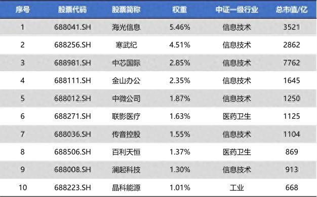 根據(jù)科創(chuàng)綜指前十大成分股來看,前5大成份股權(quán)重為17%,前10大成分股權(quán)重為24%;前十大成份股總市值為21719億元,平均總市值為2172億元。(數(shù)據(jù)來源:Wind,截至2025年3月3日)