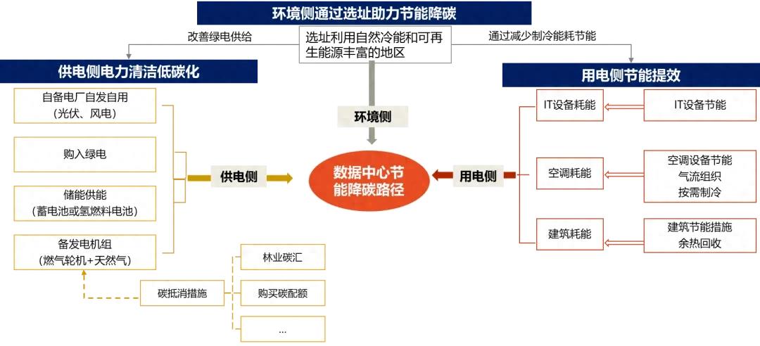 數(shù)據(jù)中心是AI模型運(yùn)營(yíng)和硬件部署的核心場(chǎng)景,數(shù)據(jù)中心的綠色低碳將直接決定AI運(yùn)營(yíng)碳足跡和AI隱含碳的分?jǐn)傂?。一方面,AI 模型的訓(xùn)練和推理依賴(lài)數(shù)據(jù)中心電力,數(shù)據(jù)中心的碳排放(如電力碳強(qiáng)度)直接影響運(yùn)營(yíng)碳,另一方面,數(shù)據(jù)中心硬件的隱含碳需通過(guò)模型的生命周期分?jǐn)?,若?shù)據(jù)中心硬件壽命短隱含碳分?jǐn)偛蛔悖瑫?huì)推高單個(gè)AI模型的總碳足跡。數(shù)據(jù)中心是AI碳足跡的核心載體,其降碳不僅是環(huán)境要求,更是AI可持續(xù)發(fā)展的必要前提。我國(guó)數(shù)據(jù)中心行業(yè)用能90%以上為電能,而70%左右的電力供應(yīng)仍依賴(lài)煤電,減碳空間巨大。從轉(zhuǎn)型路徑看,需從用電側(cè)、供電側(cè)與環(huán)境側(cè)三方面協(xié)同發(fā)力,構(gòu)建全鏈條的低碳發(fā)展體系。