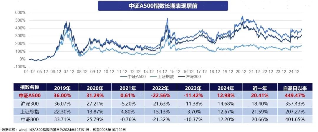 從過(guò)往中長(zhǎng)期表現(xiàn)來(lái)看,自2004年底基日以來(lái)至2025年10月22日,中證A500指數(shù)累計(jì)上漲449.47%,顯著跑贏(yíng)上證指數(shù)和滬深300指數(shù),呈現(xiàn)出“牛市跑贏(yíng)、熊市跑平”的特征。