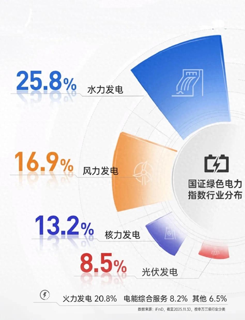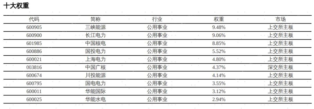 首先,指數(shù)“綠色電力”純度高,權(quán)重股聚焦綠色電力龍頭公司,“綠色”屬性明顯。根據(jù)iFinD,截至2025年12月17日,國(guó)證綠色電力指數(shù)行業(yè)分布聚焦清潔能源電力運(yùn)營(yíng)商,其中公用事業(yè)行業(yè)占比為93.58%,工業(yè)3.08%、信息技術(shù)1.21%、其他2.13%。指數(shù)前十大成分股合計(jì)占比55.83%,且多集中在風(fēng)電、光伏、水電、核電等龍頭企業(yè)。